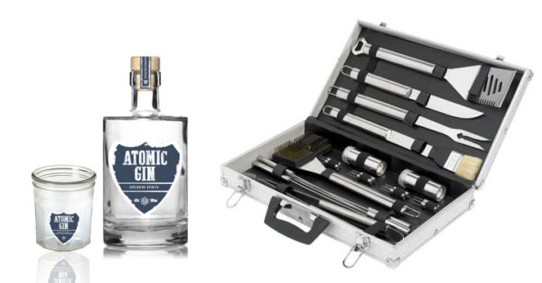 Een 21-delige, roestvrij stalen bbq-set in een aluminium koffer samen met de 100% bio, mediteraanse Atomic Gin en een Atomic Jar voor uw perfecte G&T.