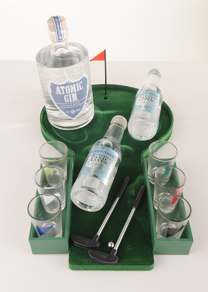 Leuk spelletjespakket met Atomic Gin, 2 Fever Tree tonic waters en Drunken Minigolf met 6 shotglazen. Let’s play golf….