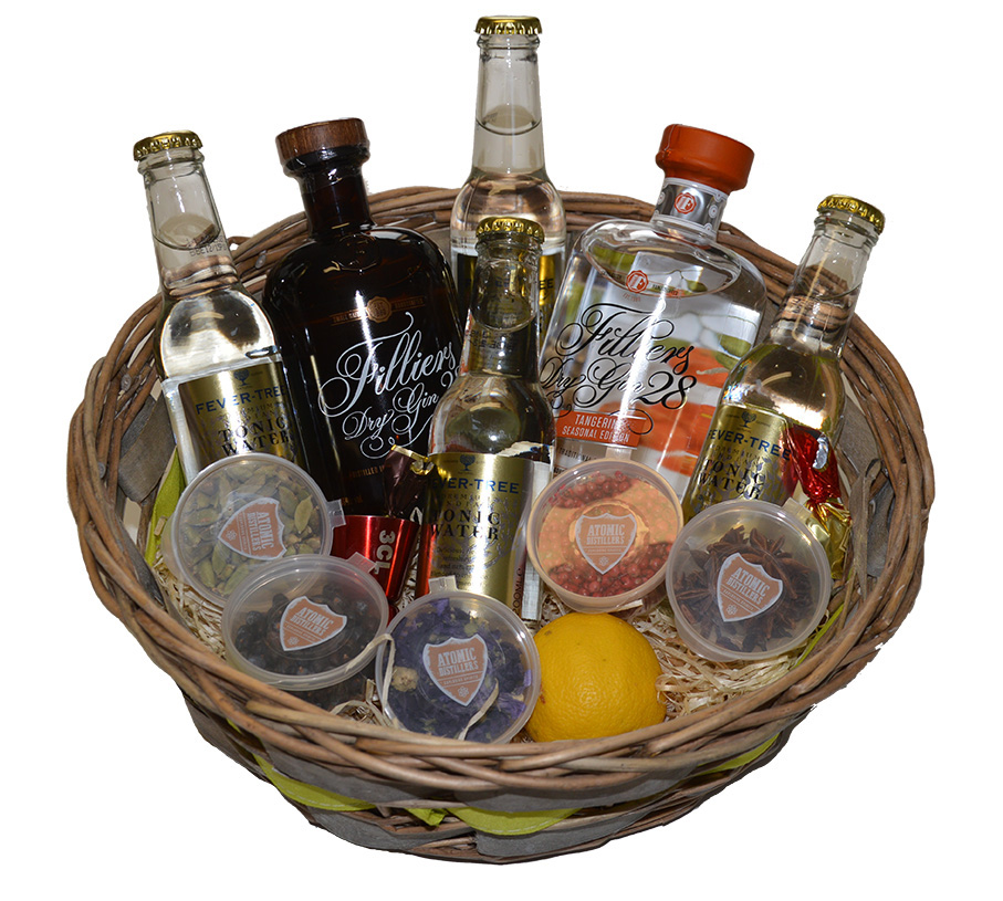 Luxepakket met zowel de Belgische Filliers 28 Dry Gin als de Filliers Tangerine Seasonal Edition in een mooie geschenkmand met 4 Fever-Tree Indian Tonic Waters, een barmaatje, 5 doosjes botanicals met een handleiding en een citroen.