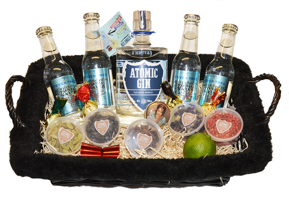 Luxueuze geschenkmand met de fris-florale Aduro Gin, een gin Journal, 4 Fever-Tree Mediteranean Tonics, 5 doosjes botanicals met handleiding, een professionele jigger en een limoen.