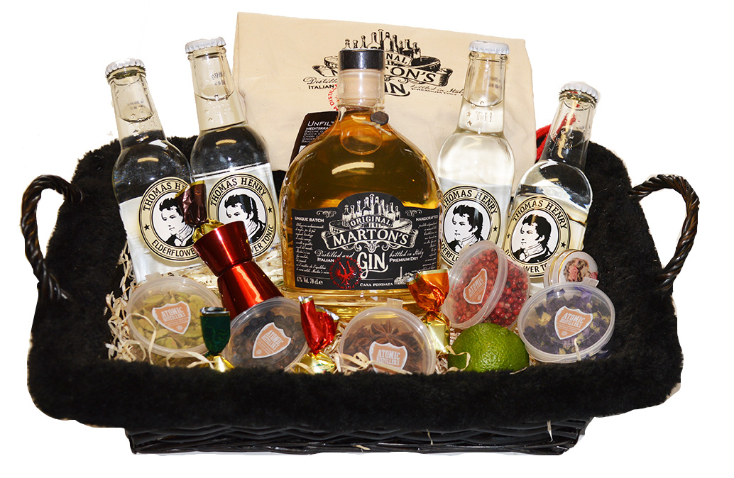 Luxe mand met 1 fles Robymarton Original Italian Premium Dry Gin, 4 Thomas Henry Tonics, 5 doosjes botanicals, 1 professionele jigger en 1 limoen.
